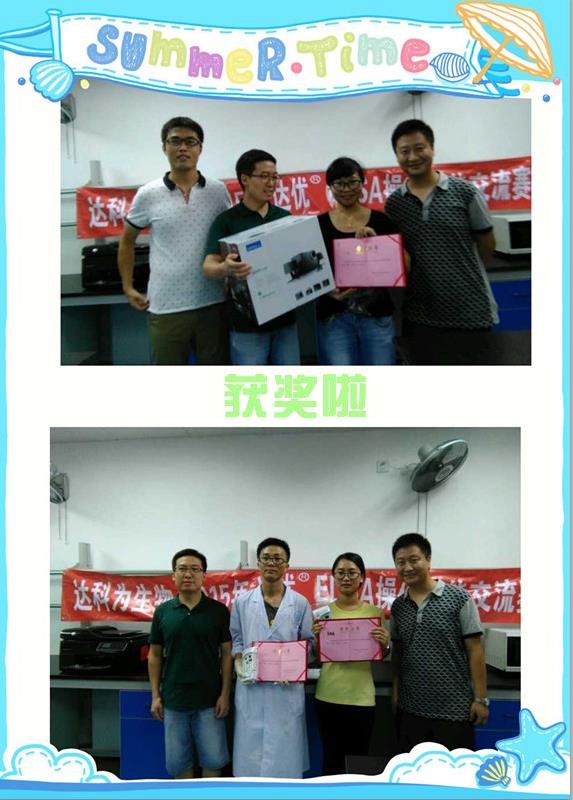 上午9點(diǎn)半正式開(kāi)始,先是由相關(guān)人員講解比賽的注意事項(xiàng)及評(píng)分標(biāo)準(zhǔn),然后參賽人員開(kāi)始正常操作比賽。這次參賽的人員有來(lái)自彭濤課題組、黃俊課題組的學(xué)生以及研究所的技術(shù)人員。此次參賽的大部分人員由于都有一定的ELISA實(shí)驗(yàn)基礎(chǔ),因此比賽的流程進(jìn)行地比較順暢,其中有一位同學(xué)接下來(lái)的課題剛好需要用到ELISA檢測(cè),他說(shuō)通過(guò)這次的交流賽,也是為接下來(lái)的實(shí)驗(yàn)?zāi)M操作,能夠幫助自己發(fā)現(xiàn)實(shí)驗(yàn)操作中的不足和漏洞,收獲頗豐。并且還說(shuō)今后購(gòu)買(mǎi)試劑盒會(huì)優(yōu)先考慮我們達(dá)優(yōu)?試劑盒的。免疫所的老師不僅幫我們監(jiān)督評(píng)分還幫我們頒獎(jiǎng),還介紹說(shuō)這次所里的有些學(xué)生暑假回家了,人數(shù)比較少,不然這是一個(gè)很好的交流機(jī)會(huì),同時(shí)也希望我們以后還有更多這樣的實(shí)驗(yàn)技能交流賽。