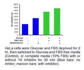 BioVision EZCellTM Glucose Uptake Assay kit 是一種簡單而超級靈敏、易用的葡萄糖攝取檢測試劑盒。試劑盒利用一種特殊的己糖激酶抑制劑抑制己糖激酶,己糖激酶是糖代謝過程中涉及到的第一個酶,在葡萄糖被細胞攝取后,可捕獲葡萄糖。 葡萄糖攝取是利用一系列酶反應檢測的,被氧化的葡萄糖產(chǎn)生的中間產(chǎn)物可以與OxiRed?探針反應而發(fā)出熒光信號(Ex/Em=535/587 nm) 。熒光信號量直接反應細胞所攝取和積累的葡萄糖。不像其他試劑盒是直接檢測葡萄糖衍生物,BioVision 提供了一種直接而強大的葡萄糖研究工具,可用于篩選和表征葡萄糖攝取相關疾病的藥物。