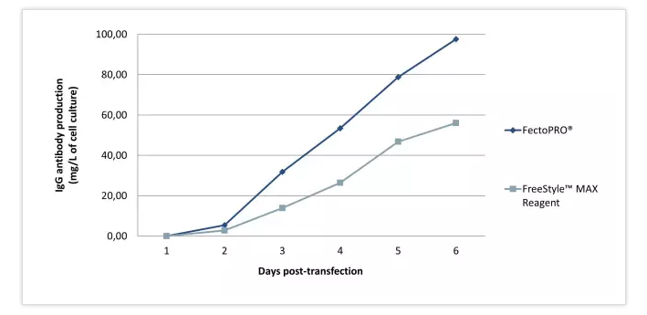 圖1. FectoPRO?大幅提高懸浮CHO細(xì)胞的抗體產(chǎn)量。按1×106個(gè)細(xì)胞/ml的密度將細(xì)胞培育在30ml的無血清培養(yǎng)基中,并依照每種試劑說明書推薦用量FectoPRO?(0.8 μg DNA/ml)或FreeStyle?MAX試劑(1.25 μg DNA/ml)進(jìn)行轉(zhuǎn)染。用蛋白質(zhì)G生物感應(yīng)器(fortéBIO? octet RED96 system)對(duì)重組小鼠IgG的產(chǎn)量監(jiān)測1~6天。——ProteoGenix SAS(法國)提供的數(shù)據(jù)。