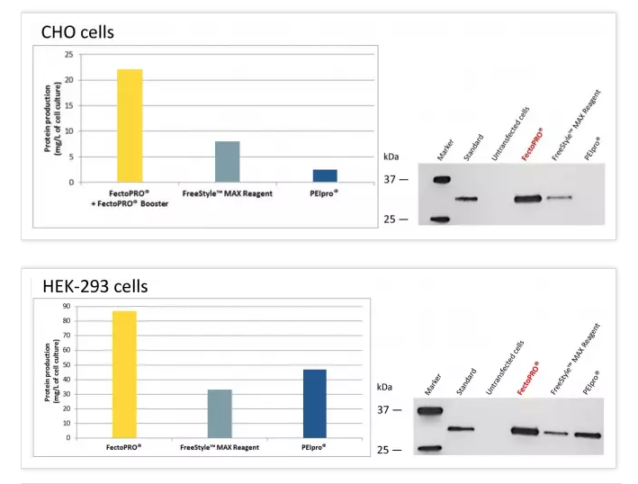 圖2. FectoPRO?大幅提高懸浮CHO和HEK-293細(xì)胞的蛋白產(chǎn)量。按1×106個(gè)細(xì)胞/ml的密度將FreeStyle? CHO-S和HEK-293F細(xì)胞培育在30 ml的無血清培養(yǎng)基中,并依照每種試劑說明書推薦用量FectoPRO?+FectoPRO?輔助藥劑Booster (0.4 μg DNA/ml)、FreeStyle?MAX試劑(1.25 μg DNA/ml)或PEIpro?(1 μg DNA/ml)進(jìn)行轉(zhuǎn)染。用蛋白質(zhì)G親和性定量法(HPLC)和Western Blot檢測轉(zhuǎn)染后72小時(shí)(CHO細(xì)胞)和120小時(shí)(HEK-293細(xì)胞)的IgG3-Fc (34 kDa)的產(chǎn)量。