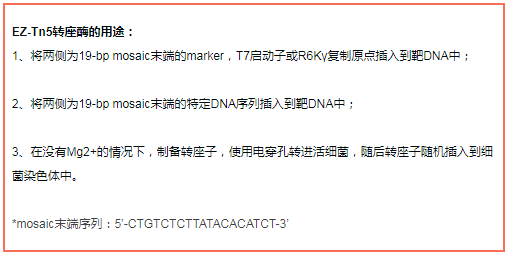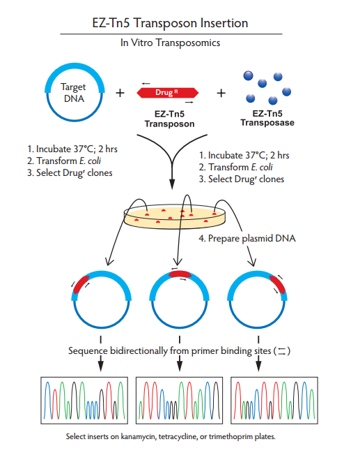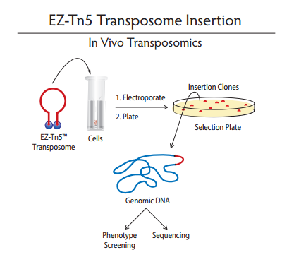 EZ-Tn5轉(zhuǎn)座子可在體外插入到含有靶DNA的載體。當EZ-Tn5轉(zhuǎn)座子在沒有鎂離子孵育時,形成穩(wěn)定的EZ-Tn5轉(zhuǎn)座體復合體,可以被電擊進入活細胞,一旦進入細胞中,轉(zhuǎn)座體由細胞內(nèi)鎂離子活化,就能隨機插入到宿主的基因組DNA中。