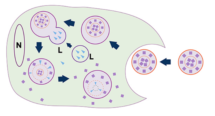 圖. Clophosome?巨噬細(xì)胞耗竭的原理。包裹著氯磷酸的脂質(zhì)體Clophosome?借助巨噬細(xì)胞的內(nèi)吞作用進(jìn)入細(xì)胞,與溶酶體融合后,在磷酸酶的作用下,釋放出氯磷酸,當(dāng)細(xì)胞內(nèi)的氯磷酸濃度達(dá)到一定閾值,就會對巨噬細(xì)胞造成不可逆轉(zhuǎn)的損害,從而迫使其進(jìn)入細(xì)胞凋亡程序。