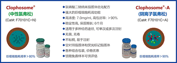 體內(nèi)巨噬細(xì)胞耗竭(in vivo macrophage depletion)是巨噬細(xì)胞功能研究的重要方法之一。FormuMax公司推出的Clophosome?系列產(chǎn)品就是將膜不通透性的氯磷酸鹽—氯磷酸二鈉(clodronate)包裹于脂質(zhì)體內(nèi)并帶入細(xì)胞,利用巨噬細(xì)胞的內(nèi)吞機(jī)制實現(xiàn)巨噬細(xì)胞的耗竭。