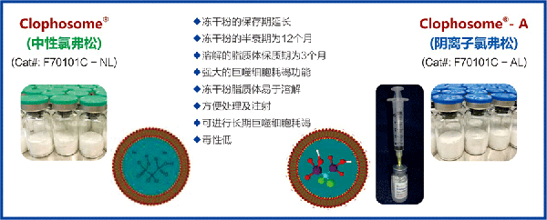 為了延長脂質(zhì)體的保質(zhì)期,廠家已成功推出凍干粉狀的Clophosome?產(chǎn)品,其質(zhì)保期已延長至12個月。通過簡單的溶解,即可成功獲得氯磷酸鹽脂質(zhì)體。同樣,凍干粉狀的Clophosome?保持了與液態(tài)Clophosome?同樣杰出的巨噬細(xì)胞耗竭功能,以及活性高,使用方便,無菌無毒,以及高濃度,高包封率,不粘稠,無沉淀,易于注射等諸多優(yōu)越性能,尤其是凍干粉狀的Clophosome?克服了脂質(zhì)體保質(zhì)期短,穩(wěn)定性差的缺陷。