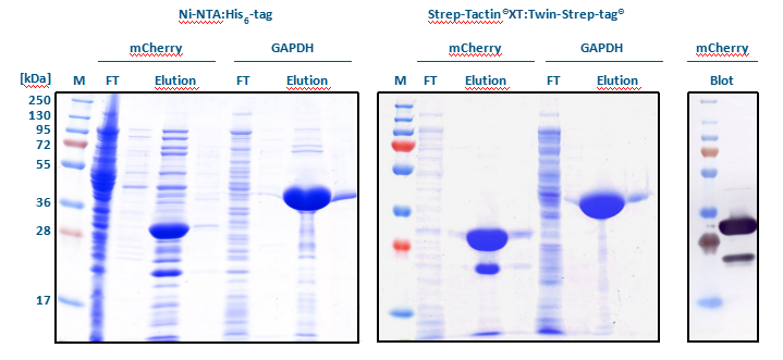 以SDS-PAGE分析發(fā)現(xiàn),不管是mCherry或是GAPDH,使用Strep-tactin? XT: Twin-Strep-tag?都能得到純度較高的目標蛋白(見Elution)。Western Blot分析結果顯示,提取mCherry所出現(xiàn)的雜質(zhì)為其降解產(chǎn)物。