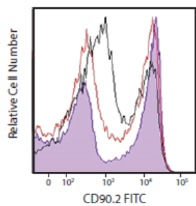 (將小鼠脾臟細(xì)胞分別用TruStainFcX TM PLUS(0.25μg/test,紫色填充直方圖),TruStainFcX TM(克隆93,1μg/test,紅線(xiàn))封閉之后用CD90.2FITC染色,與未處理的小鼠脾臟細(xì)胞(黑線(xiàn))作比較。結(jié)果顯示TruStainFcXTM PLUS封閉效果更優(yōu)。)