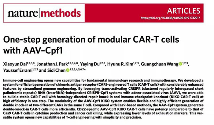 作者利用腺相關(guān)病毒( AAV )與CRISPR -Cpf1系統(tǒng),開發(fā)了一種高效的制備的Car-T的方法,而且具有顯著增強的特征。該技術(shù)使得Car-T制備的高效性大大提高。