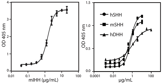C3H10T1/2干細胞培養(yǎng)至細胞融合,使用BMP-9(20 ng/mL, Cat. No. 553102)和不同濃度的h/mSHH、或hDHH、或mIHH(Cat. No. 753502, 754602, 759802,758602)處理,將間充質(zhì)干細胞誘導(dǎo)分化為成骨細胞。使用對硝基苯磷酸酯作為底物,檢測成骨細胞標記物堿性磷酸酶。