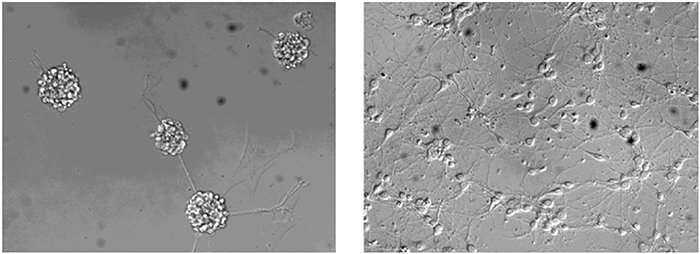 Midkine增強了培養(yǎng)三天的大鼠胚胎(E18)皮層神經(jīng)元的神經(jīng)突起生長;左(未處理),右(0.4 μg/mL的人Midkine