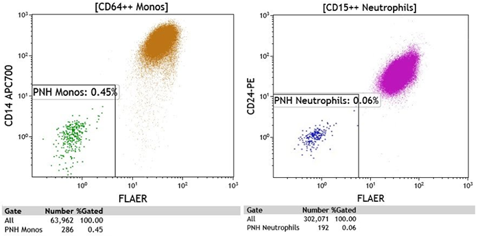 圖:取新鮮PNH病人外周血裂紅后用FLAER染色,分析單核細(xì)胞、粒細(xì)胞中的PNH克隆數(shù) [1]