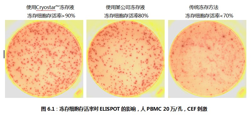 考慮到ELISPOT檢測的特殊性,荷蘭U-CyTech公司經(jīng)過精心的研究與反復(fù)的驗證,推出了Cryostar?凍存試劑盒,在凍存液中添加了一系列對細胞有特殊保護作用的保護劑。達科為公司在接到Cryostar?凍存試劑盒之后,在我們的實驗室以及國內(nèi)數(shù)家客戶的實驗室做了細胞凍存與復(fù)蘇的實驗,并且對復(fù)蘇之后的細胞做了ELISPOT檢測。結(jié)果表明,淋巴細胞的存活率超過90%,ELISPOT斑點形成頻率與新鮮細胞完全相同。參見圖6.1。
