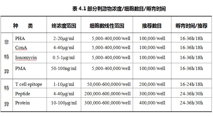 不論是普通多肽(比如重疊多肽庫)還是蛋白質(zhì)或者蛋白類的組織提取物,這些刺激物都需要APC的攝取、內(nèi)化、加工、呈遞,之后T細(xì)胞才能被刺激。所以,使用這些刺激物的時(shí)候,一定要保證足夠的細(xì)胞密度。根據(jù)我們的經(jīng)驗(yàn),細(xì)胞密度要至少達(dá)到20萬-30萬每孔。多肽推薦的細(xì)胞密度為30萬/孔,蛋白推薦的細(xì)胞密度為40萬/孔。也可以根據(jù)實(shí)際情況,在線性范圍內(nèi)調(diào)整,參見表4.1與圖4.2。