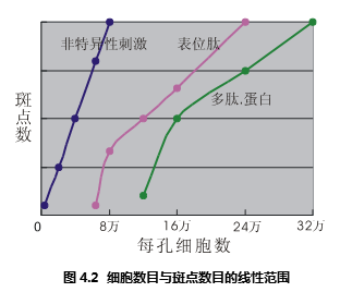 非特異性的刺激物可以直接刺激淋巴細(xì)胞,這種刺激不依賴于APC或者其它輔助細(xì)胞,是單細(xì)胞反應(yīng)行為。所以它對(duì)細(xì)胞密度沒有要求,在極寬的細(xì)胞濃度范圍之內(nèi)——多至40萬/孔,低至5千/孔——斑點(diǎn)數(shù)量和細(xì)胞數(shù)量都有簡(jiǎn)單的正比例關(guān)系,參見圖4.2。但是考慮到,只有恰當(dāng)?shù)陌唿c(diǎn)數(shù)目才便于數(shù)據(jù)統(tǒng)計(jì),所以推薦細(xì)胞密度為10萬/孔。如果細(xì)胞數(shù)目過多,滿孔都會(huì)被斑點(diǎn)覆蓋,并且相互重疊。