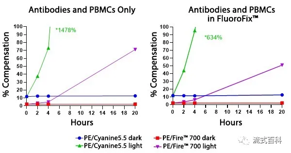 PE/Fire? 700 和PE/Cyanine5.5標記的兩種CD4抗體檢測人PBMC,無論在避光條件下還是暴露在熒光的條件下,PE/Fire? 700的穩(wěn)定性要優(yōu)于PE/Cyanine5.5(檢測平臺為5激光Cytek? Aurora 光譜流式)。