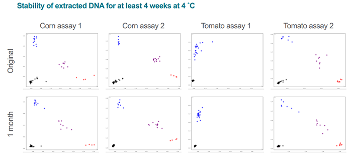 △圖2. 用QuickExtract從玉米和番茄中提取的DNA用KASP基因分型技術進行聚類(Original),然后在4℃下儲存1個月,再將樣品進行聚類(1month) ,實驗結(jié)果完全一致。