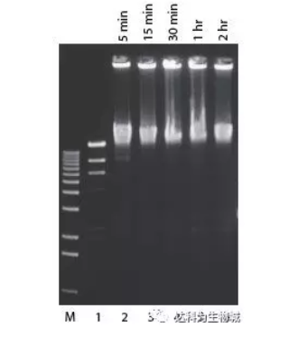 按標(biāo)準(zhǔn)連接反應(yīng)使用2U Fast-Link? ligase進(jìn)行Lambda Hind III markers連接(泳道2-6). 泳道M, 1-kb ladder;泳道1,無酶對照;泳道2-6, 分別為5 min, 15 min, 30 min, 1 hr, 2 hr連接結(jié)果。