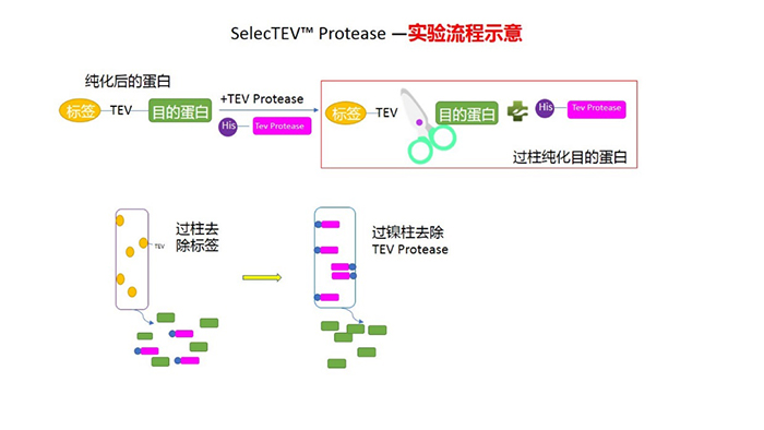 SelecTEV?蛋白酶是一種基因工程改造的煙草蝕刻病毒(TEV)蛋白酶,通過His標簽的親和層析從大腸桿菌中純化,SDS-PAGE分析表明其純度為90%。SelecTEV?蛋白酶能夠識別Glu-Asn-Leu-Tyr-Phe-Gln-Gly七個氨基酸以及與其密切相關(guān)的序列,并在Gln和Gly殘基之間進行切割。 這七種氨基酸序列在蛋白質(zhì)中很少見,使得SelecTEV?蛋白酶成為從融合蛋白中去除標簽的理想選擇。利用蛋白酶N-末端的His標簽通過親和層析即可從酶切反應(yīng)中除去SelecTEV?蛋白酶。