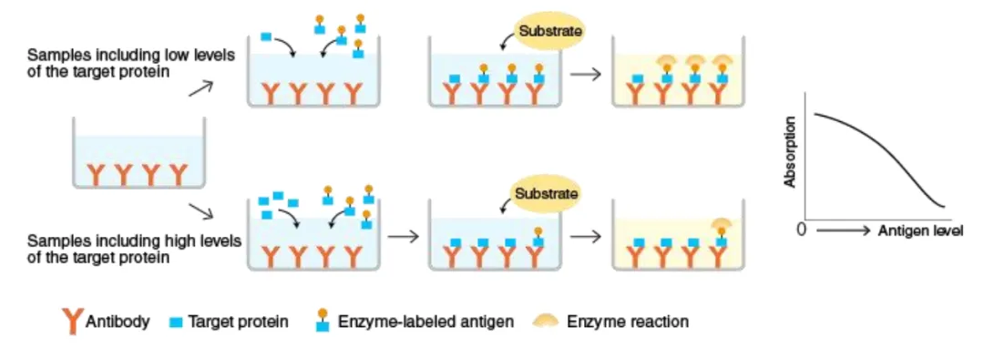 1、樣本中分析物水平較低可以使用哪些方法改進檢測?通過增加洗滌次數和兩次洗滌之間的浸泡時間降低背景。控制測定精確度。例如,在移液時要更加小心和一致,使用干凈的紙巾拍板,以避免污染。增加孵育時間。但這通常也會增加背景,因此檢測靈敏度不一定會增加。如果可以的話,建議濃縮樣本。使用5-PL曲線擬合方法,更準確地計算標準曲線下端的樣本濃度。在大多數情況下,樣本可能只含有非常低或無法檢測到的分析物水平。這時無論如何操作和測定,仍然無法檢測到準確濃度。2、包板應如何存放?如果包被完抗體的板不能立即使用,應將其密封并在4°C儲存過夜。3、為什么使用同一克隆號的捕獲抗體和檢測抗體建立ELISA實驗沒有成功?如果使用相同的克隆抗體進行檢測和捕獲,則抗原表位可能已經被其中一種抗體占據并抑制另一抗體結合。建議捕獲和檢測抗體選擇不同的克隆號。4、應該使用哪種包被緩沖液?一般來說,建議使用PBS(pH 7.4)或碳酸鹽緩沖液(pH 9.5)。確切的包被緩沖液可能取決于要檢測的細胞因子。5、為什么細胞因子流式染色與ELISA測定之間沒有良好的相關性?流式細胞術檢測的胞內細胞因子代表檢測時的陽性細胞比例,ELISA代表細胞因子隨時間的積累量??赡苌倭康年栃约毎谝欢螘r間之后會分泌大量的細胞因子于培養(yǎng)上清中,導致ELISA的結果與胞內因子染色的結果不一致6、可以使用細胞培養(yǎng)板進行ELISA實驗嗎?不可以。細胞培養(yǎng)板設計用于達到細胞培養(yǎng)目的,通常不具有高蛋白結合能力。對于ELISA,建議使用具有高蛋白結合能力的板,例如 Nunc Maxisorp?酶標板。7、血清等樣本可以重復使用嗎?不建議重復使用樣本。為了獲得準確的結果,樣本應分裝儲存,僅供一次性使用。如果重復使用樣本,需要進行額外的驗證實驗,以確保實驗準確性。8、在什么步驟中,可以暫停ELISA實驗?可以冷凍板子以備后用嗎?最好遵循說明書操作,沒有任何可以暫停實驗的步驟。但是,如果一定需要暫停實驗,建議在封閉步驟(包被捕獲抗體后)??梢栽诳字屑尤?00 μL封閉緩沖液,并將板在4°C過夜(信號損失最小或沒有)或在-20°C冷凍幾天(可能會對信號產生一些影響)。不建議在第一步進行(在4°C用捕獲抗體包被超過16-20小時),因為可能會導致高背景。9、包被捕獲抗體可以超過過夜的時間嗎?通常來說,建議在4°C包被16-20小時。較長的孵育時間可能會增加與板結合的捕獲抗體量,會增加背景。10、培養(yǎng)基中的酚紅會干擾ELISA測定嗎?不會,培養(yǎng)基中酚紅的吸光度可以在計算時,通過扣除空白孔中本底的吸光度而消去,因此不會干擾ELISA測定的讀數。11、對于一些ELISA試劑盒,為什么血清樣本需要稀釋?血清樣本稀釋可以盡量減少樣本和標準品之間的基質差異,以獲得更加準確的結果。12、如何提高ELISA檢測獲得更好的信號和靈敏度?增加孵育時間,但這也可能會增加檢測的背景,同時不改變靈敏度。在孵育步驟中搖動板子。確保標準品在使用前完全溶解。在兩次洗滌之間增加浸泡時間,以進一步降低背景。如果可以的話,在450-570 nm處讀板以減去本底。通過控制移液誤差或使用更大體積的洗滌緩沖液洗滌來改善CV值。使用5-PL或4-PL曲線擬合方法,而不是線性曲線擬合。