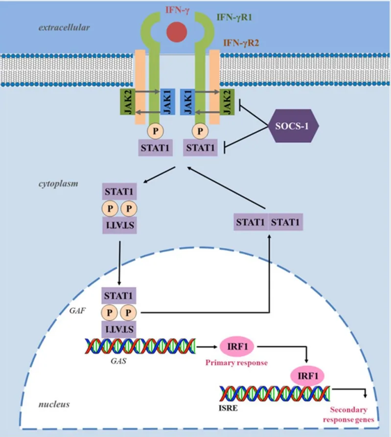 IFN-γ信號通路協調多種生物反應,在先天和適應性免疫中扮演的重要角色。IFN-γ可以通過促進Th1細胞、CD8+T淋巴細胞、NK細胞、樹突狀細胞及巨噬細胞的活性,抑制Treg、Th2和Th17細胞分化和功能,發(fā)揮免疫調節(jié)作用。此外,IFN-γ可激活巨噬細胞,使其分化為M1型巨噬細胞。